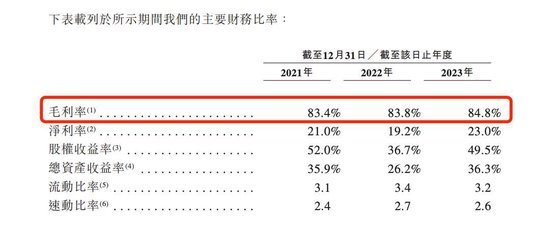 过去三个完整财年里,毛戈平公司的营收复合年增长率为35.3%,净利润复合年增长率为41.6%,毛利率也保持在较高水准,接近85%。其现金流状况也较为稳定,2023年末,其账上现金及等价物11.38亿元,同比增长了28%。