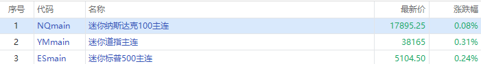 华盛资讯4月17日消息,三大期指盘前走高,截至发稿,纳指期货 $NQmain 涨0.08%,标普500指数期货 $ESmain 涨0.24%,道指期货 $YMmain 涨0.31%。