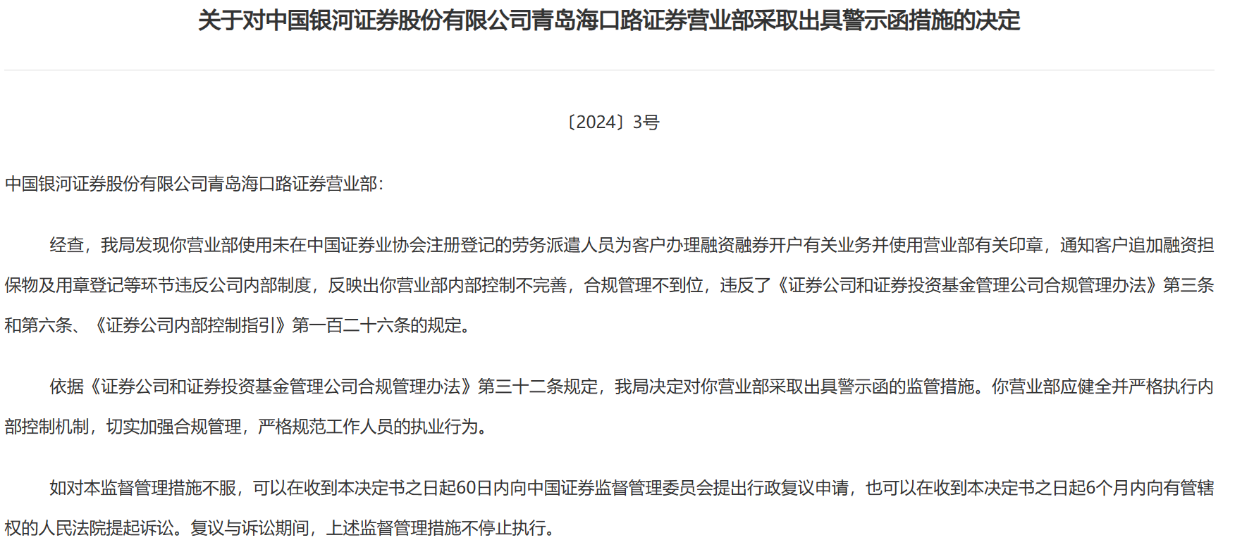 3月7日,青岛证监局发布公告,中国银河青岛海口路证券营业部因使用未在中国证券业协会注册登记的劳务派遣人员为客户办理融资融券开户有关业务,并使用营业部有关印章,通知客户追加融资担保物及用章登记等环节违反公司内部制度。