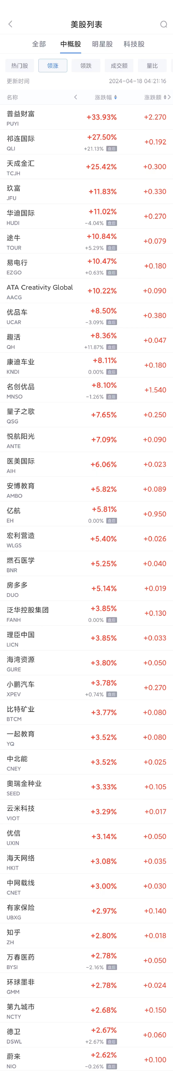 领涨中概股列表: