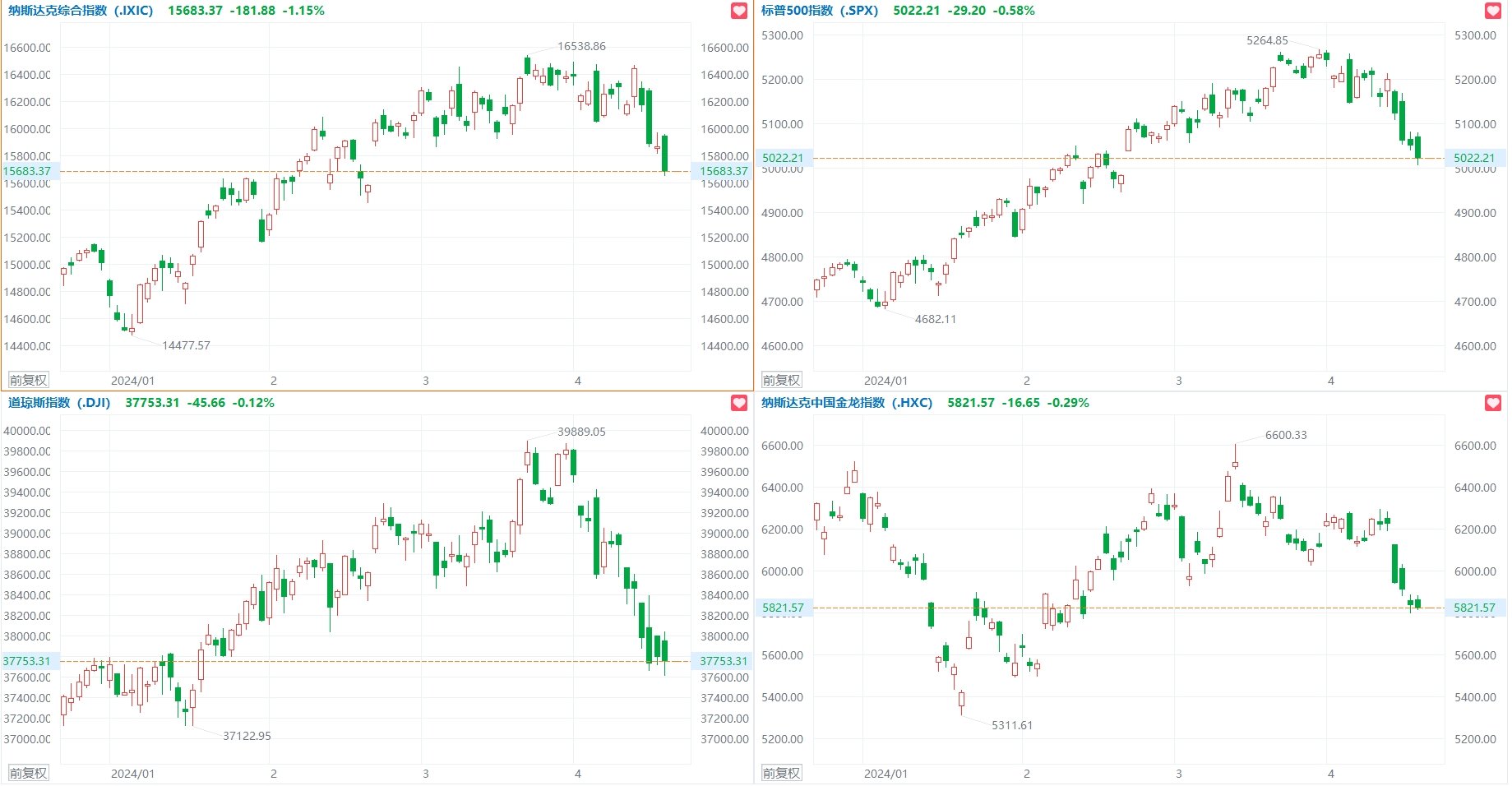 格隆汇4月18日|美股三大指数集体收跌,道指跌0.12%,纳指跌1.15%,标普500指数跌0.58%,热门科技股多数下跌,英伟达跌超3%,特斯拉、亚马逊、Meta均跌超1%。航空公司、贵金属涨幅居前,美联航涨超17%,美国航空涨超6%,阿拉斯加航空、捷蓝航空涨超4%,沙尘暴黄金、Lamgold涨超3%,哈莫尼黄金涨超2%。半导体、机器人、区块链板块跌幅居前,阿斯麦跌超7%,AMD跌超5%,科磊、美光科技、纳微半导体跌超4%,Coinbase跌超2%。热门中概股涨跌不一,纳斯达克中国金龙指数跌0.29%。小鹏汽车涨超3%,蔚来涨超2%,爱奇艺、理想汽车涨超1%,微博、哔哩哔哩、京东、腾讯音乐小幅上涨。唯品会跌超2%,百度、阿里巴巴跌超1%。