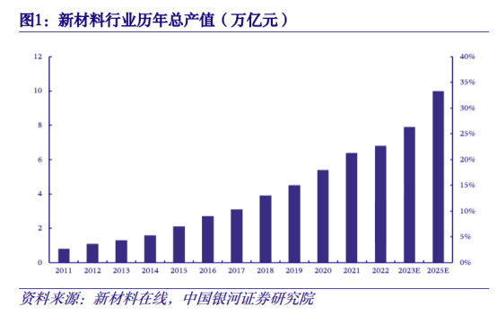 根据工信部数据,2022年我国新材料产业总值达到6.8万亿元,与2012年相比规模扩大近6倍,预计到2025年,我国新材料总值将达到10万亿的规模,2022-2025年三年复合增长率10%,市场空间广阔。