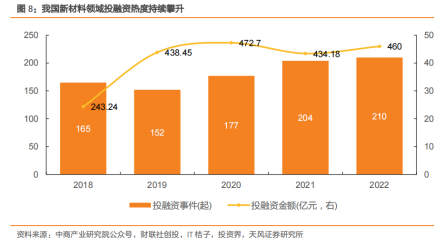 新材料行业具有高成长性,近年来投融资持续火热,行业成为资金聚焦的热点。据财联社创投数据,2022年我国新材料领域共发生投融资事件210起,涉及投资金额超460亿元,在整体投资行情下调的背景下,新材料赛道实现逆势增长,热度持续攀升。随着新材料战略新兴产业的发展地位进一步提升,有望持续得到政策和资金的助力,进入发展加速期。