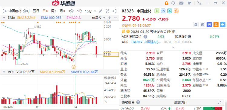 4月18日讯,港股中国建材(03323)发盈警,早盘股价应声下跌,截至发稿,报2.78港元,跌7.95%,成交额3213.29万港元。