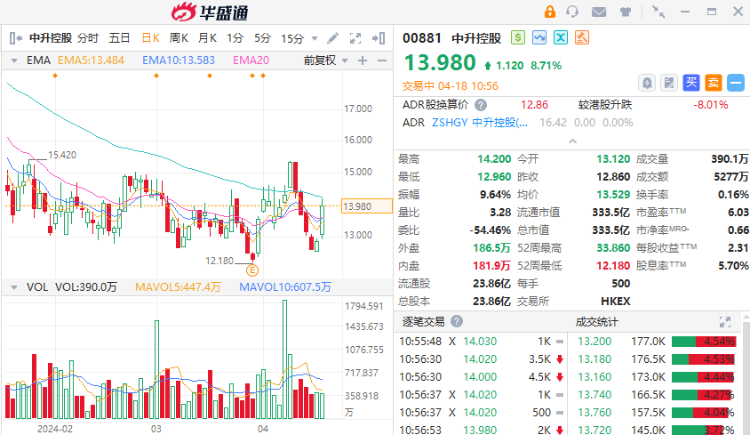 4月18日讯,中升控股早盘涨超8%,截至发稿,涨8.71%,报13.98港元,成交额5277万港元。