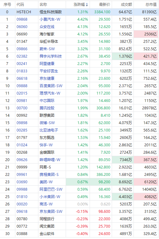 半导体、互联网医疗成分股强势,华虹半导体涨超3%,阿里健康、平安好医生、京东健康均涨超2%。