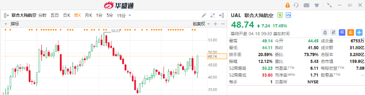 - 联合大陆航空周三大涨17.45%,创下自2020年以来最大涨幅;全周累涨16.60%