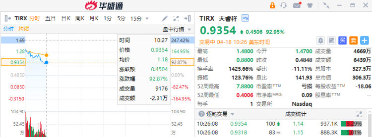 保险经纪有限公司天睿祥 $TIRX 计划进行股份合并投票,此次合并将把每五股现有的 A 类和 B 类普通股转换为一股,盘初一度大涨160%,现涨幅收窄至92%。