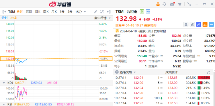 台积电盘初跌超4%,第一季度收入为5926.4亿新台币,同比增长16.5%,环比下降5.3%;净利润为2254.9亿新台币,同比增长8.9%,环比下降5.5%。