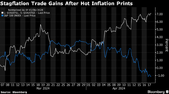高盛集团一个指数衡量的是做多滞胀利好股、同时做空滞胀利空股的表现,该指数自4月初以来已上涨近5%,势将创下一年来的最大月度涨幅。