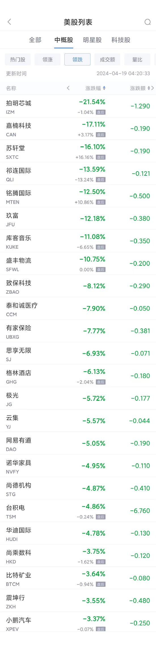 领跌中概股列表: