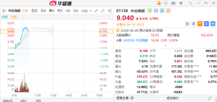 华盛资讯4月19日消息,中远海能逆势走高,截至发稿,涨4.75%,报9.04港元,成交额8160万港元。