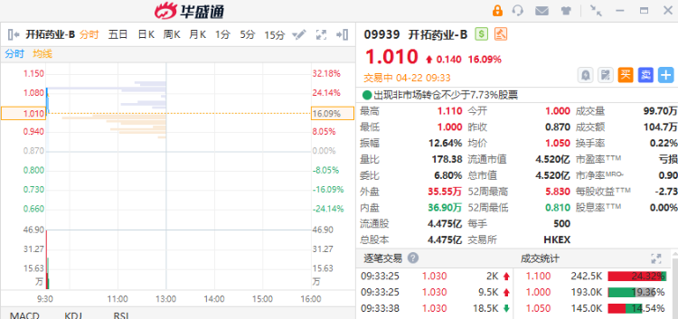 4月22日,开拓药业-B(09939)早盘高开,截至发稿,涨16.09%,报1.01港元,成交额104.7万港元。