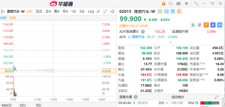 华盛资讯4月22日消息,理想汽车早盘低开,截至发稿,跌超6%,报99.9港元,成交额4.581亿港元。