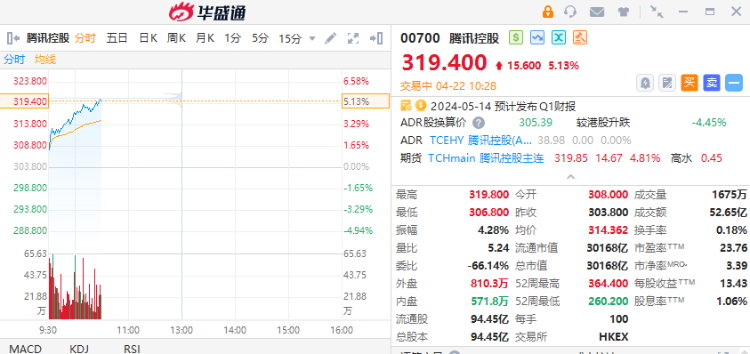 4月22日,腾讯(00700)早盘走强,截至发稿,涨5.13%,报319.4港元,成交额52.65亿港元。