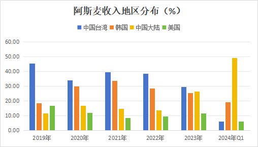 2024年以前,中国台湾是阿斯麦最主要的销售地,2019年收入占比甚至高达45%,但呈明显下滑趋势,2024年一季度仅为6%。而历史第二大客户韩国的收入占比也一降再降,2024年一季度为19%。相反,阿斯麦在中国大陆的销售占比却在近两年迅猛增长,2024年一季度达到49%的占比,连续三个季度成为阿斯麦最大的销售市场。