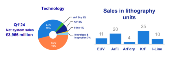 根据财报,一季度EUV和ArFi的收入占阿斯麦收入的46%和39%,具体出货方面,EUV、ArFi、ArFdry、KrF、I-Line的出货量分别为11台、20台、4台、25台、10台,相较于2023年一季度,公司的EUV出货量降低了6台,是造成公司收入下滑的具体原因之一。