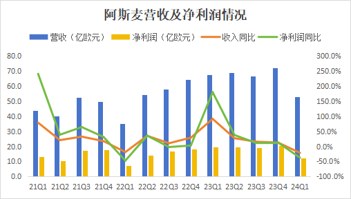 4月17日,全球光刻机巨头ASML(ASML.O)发布了2024年一季度财务业绩报告,数据显示,阿斯麦一季度实现收入53亿欧元,较去年同期下降21.6%;净利润为12.2亿欧元,较去年同期下降37.8%。