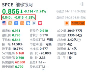 太空旅游公司维珍银河(SPCE.US)美股盘前续跌1.88%,报0.84美元。该股上周五大跌11.7%,年内已累计下跌超65%。消息面上,维珍银河控股公司宣布正在考虑进行反向拆股,比例在1:2和1:20之间。