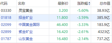 4月23日,黄金股集体回落,截至发稿,灵宝黄金跌超5%,招金矿业、中国黄金国际跌超3%,紫金矿业、山东黄金跌超2%。