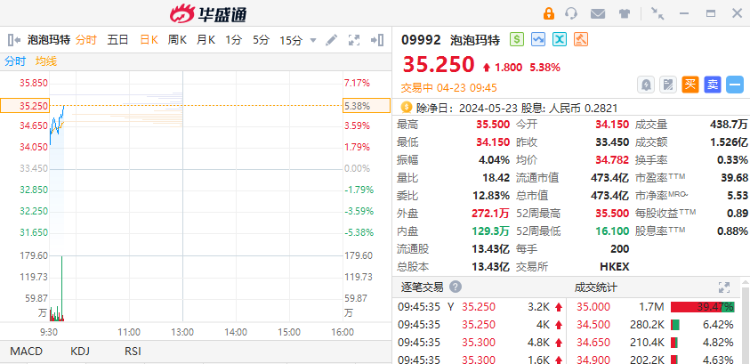 4月23日,泡泡玛特(09992)开盘走强,截至发稿,涨超5%,报35.25港元,成交额1.526亿港元。