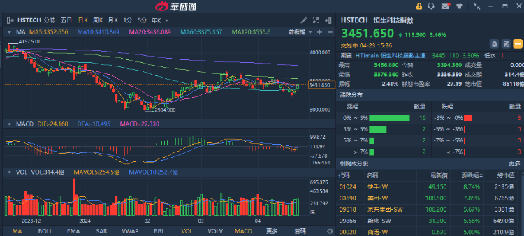 盘面上,大型科技股领衔大市上扬,快手-W涨超8%,美团-W涨超7%,京东集团-SW涨超5%,腾讯控股涨超3%重新站上330港元,股价创去年11月21日以来新高。