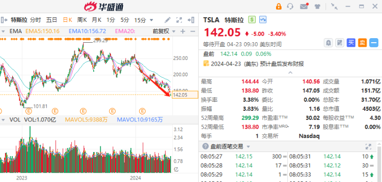 截至周一收盘,特斯拉股价今年以来下跌了43%,跌至142.05美元,并且已经连续七天下跌,因为投资者已经适应了电动汽车销售增长放缓的趋势。