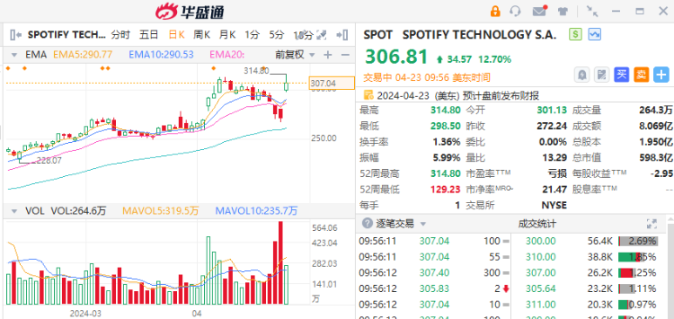 Spotify绩后大涨超12%,通用电气绩后涨超4%。