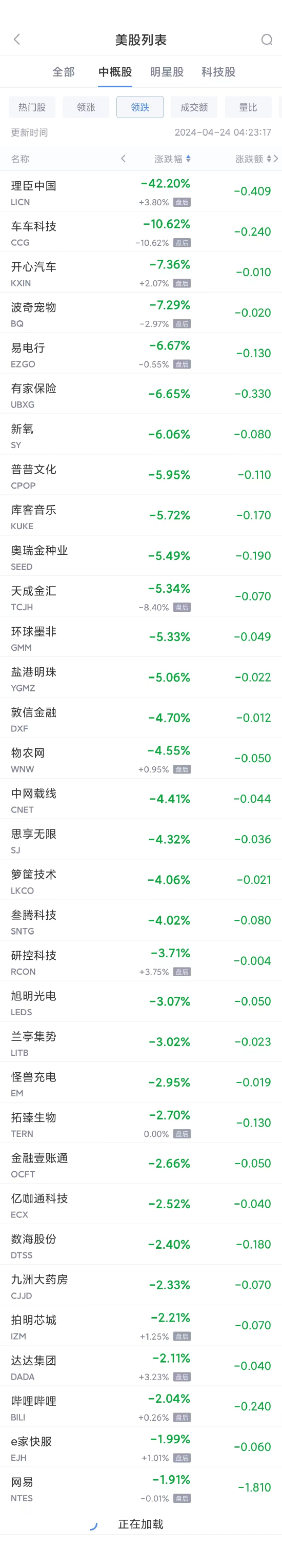 领跌中概股列表: