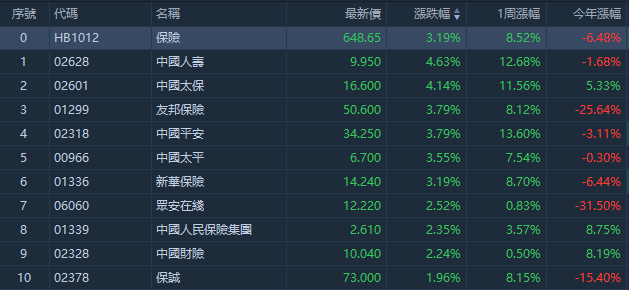 保险股走高,截止发稿,中国人寿(02628)涨4.63%,报9.95港元;中国太保(02601)涨4.14%,报16.60港元;友邦保险(01299)涨3.79%,报50.60港元;中国平安(02318)涨3.79%,报34.25港元。