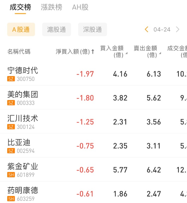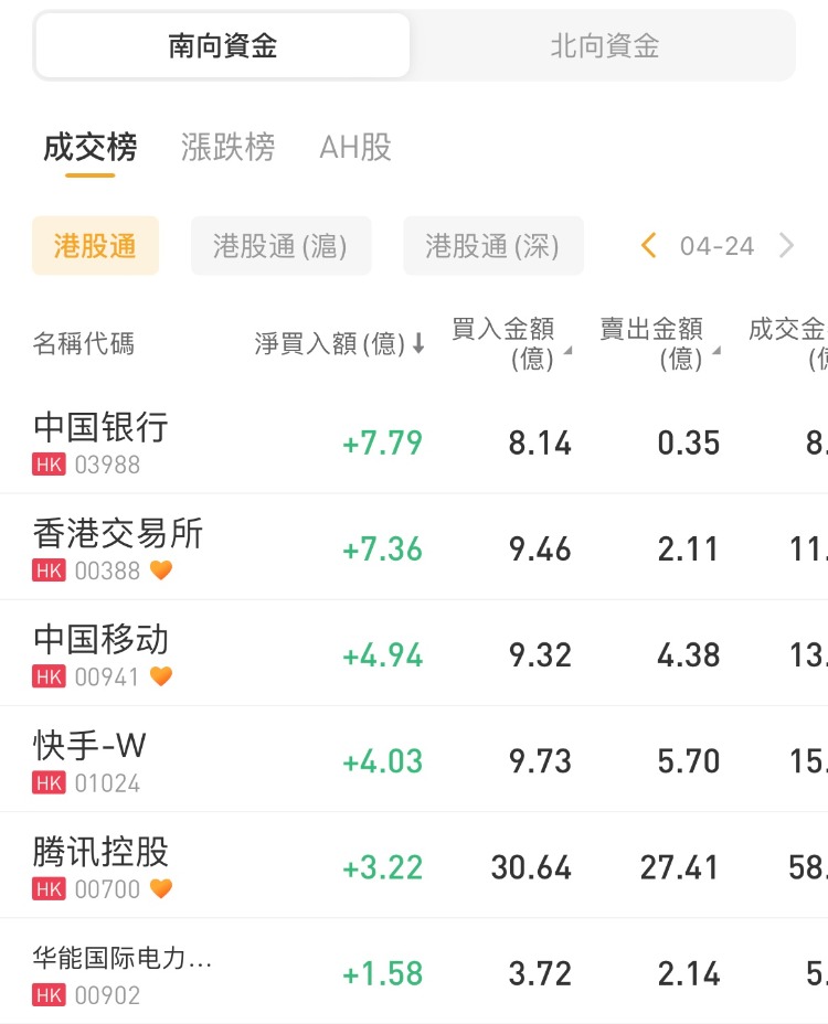 其中,南向资金净买入中国银行7.79亿港元,加仓香港交易所、中国移动、快手-W,金额分别为7.36亿港元、4.94亿港元、4.03亿港元;净卖出美团-W15.44亿港元。