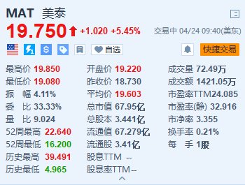 格隆汇4月24日|玩具制造商美泰(MAT.US)涨5.45%,报19.75美元。美泰第一季度销售额同比下降1%,至8.1亿美元,低于市场预期的8.335亿美元;每股亏损5美分,好于市场预期的每股亏损12美分;调整后毛利率增长8.3个百分点至48.3%。、公司预计全年调整后每股收益在1.35美元至1.45美元之间,市场预期为1.39美元。