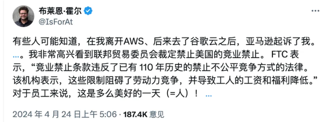 有意思的是,根据报道,在 Hall 签署协议前后的讨论中,亚马逊高管多次告诉他公司不会执行“模版”保密协议中的非竞争条款。在 FTC 最后规则发布的时刻,他也在推特上表达了自己的开心:“对于员工来说,这是多么美好的一天。”