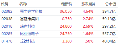 华盛资讯4月25日消息,港股苹果概念股盘中拉升,截至发稿,舜宇光学科技涨近5%,富智康集团、瑞声科技涨近3%,比亚迪电子、丘钛科技涨超1%。