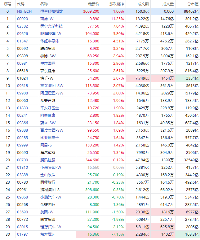 商汤-W复牌涨超11%;苹果概念股强势上扬,舜宇光学科技涨近8%,比亚迪电子涨近2%。