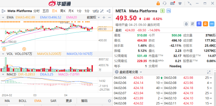 Meta Platforms盘前暴跌14%,公司虽然披露强劲的第一季度财报,但公布的Q2营收指引逊于预期,并大幅增加了全年资本支出令市场担忧。