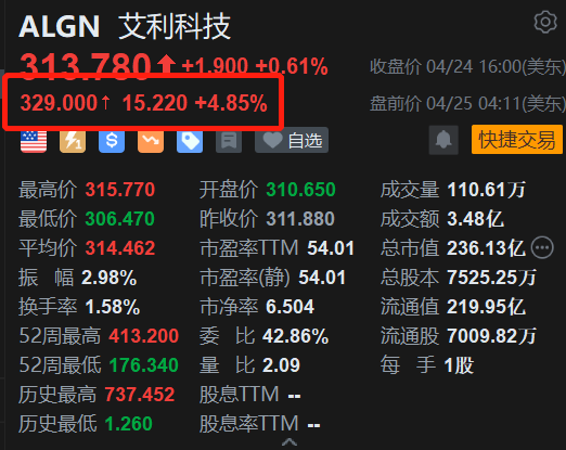 格隆汇4月25日|牙科医疗器械公司Align科技(ALGN.US)盘前涨4.85%,报329美元。消息上,公司截至3月31日的季度收入从去年同期的9.431亿美元增至9.974亿美元;每股摊薄后非GAAP收益为2.14美元,高于分析师预期的1.97美元。第二季度,该公司预计收入为10.3亿至10.5亿美元。