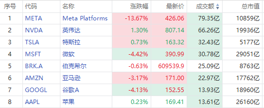 明星科技股走势分化,Meta绩后暴跌13%,微软、谷歌均跌超4%,亚马逊跌超3%。英伟达低开高走现涨1.4%。