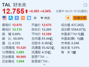 格隆汇4月25日|好未来(TAL.US)涨超4%,报12.755美元。好未来公布截至2024年2月29日的第四季度财报显示,第四季度净营收4.296亿美元,同比增长60%,高于市场预期的3.861亿美元;调整后每ADS收益0.08美元,上年同期每股亏损0.02美元,亦高于市场预期的0.02美元。