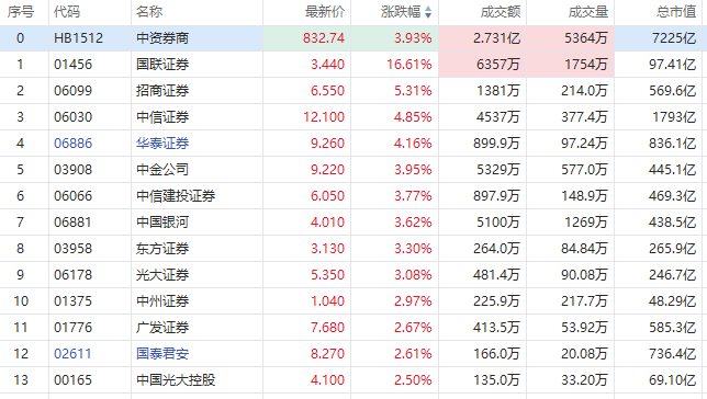 受消息驱动,港A券商股今日集体高开。港股方面,截至发稿,国联证券涨超16%,招商证券涨超5%,中信证券、华泰证券涨超4%,中金公司、中信建投证券、中国银河、光大证券涨超3%,广发证券、国泰君安等涨超2%。