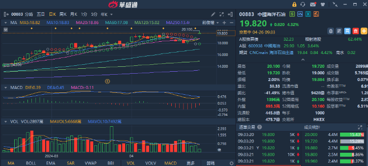 消息面上,中海油发布2024年第一季度业绩,该集团期内取得营业收入1114.68亿元人民币,同比增加14.1%;归母净利润397.19亿元,同比增加23.7%。中金表示,一季度业绩超市场预期,主要系产量增速和原油实现价格超出预期。