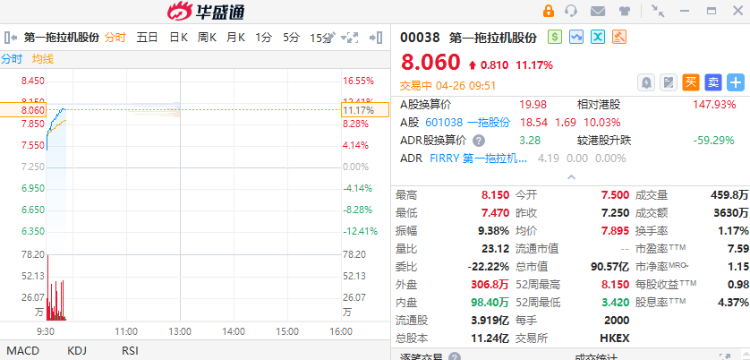 4月26日,第一拖拉机股份(00038)早盘走强,截至发稿,涨11.17%,报8.06港元,成交额3630万港元。