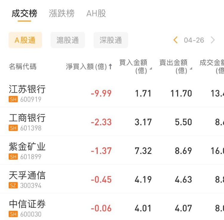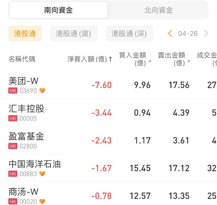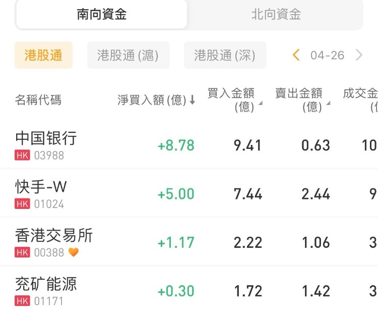 其中,南向资金净买入中国银行8.78亿港元,加仓快手-W、香港交易所,金额分别为5亿港元、1.17亿港元;净卖出美团-W 7.6亿港元。