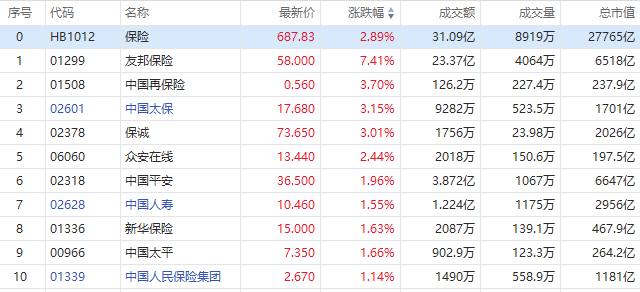 华盛资讯4月29日消息,港股内险股盘初持续上扬,截至发稿,友邦保险涨超7%,中国太保涨超3%,众安在线涨超2%,中国人寿、新华保险、中国太平、中国人民保险集团涨超1%。
