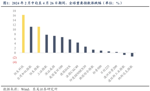 24年2月中旬以来,港股触底反弹,截至4月26日,恒生科技及恒生指数的区间涨跌幅分别达到16.27%、11.16%,显著跑赢标普500、日经225在内的全球重要指数。本周,恒生指数更是迎来五连阳,完美收复了年初下跌的“失地”。
