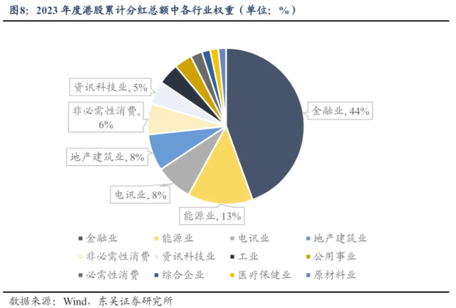 其中,大盘蓝筹股是港股派息的主力,金融、能源、电讯、地产建筑、非必须消费行业的23年年度分红金额达1.6万亿港元,占全部港股的80%;同时,23-24年众多白马股加大分红力度,23年分红同比大幅提升的个股主要集中于资讯科技、非必须消费和医疗保健业,叠加近期腾讯、阿里等宣布24年分红回购计划,进一步助推了科技股的上涨。