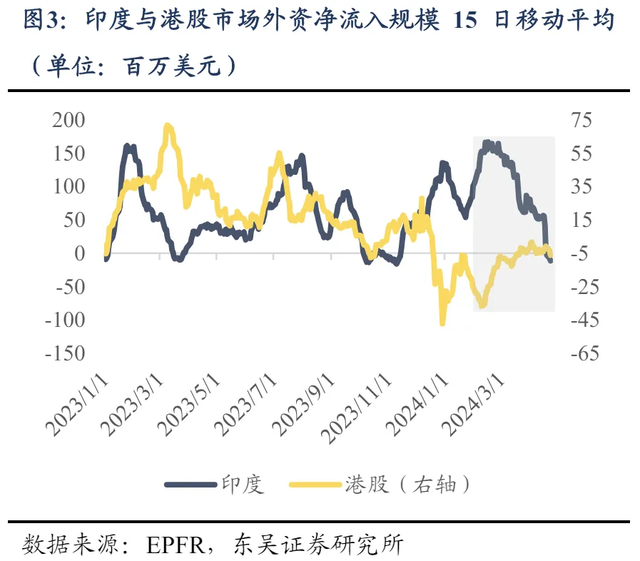 近日,港股的外资净流出规模收窄,与日股/印度股市形成资金面跷跷板,或提示部分全球/亚洲配置的资金欲逐步降低日印股票的仓位,并增加对于港股的配置。基于EPFR口径,我们发现2月中旬前后,日股和印度股市的外资净流入规模开始触顶回落,而相对应地,港股净流出量逐步收敛。在亚太基金中,截至3月日股仓位高达 46.9%,而港股和A股均在5%左右,说明外资对于中国资产仍具备较为广阔的增配空间。