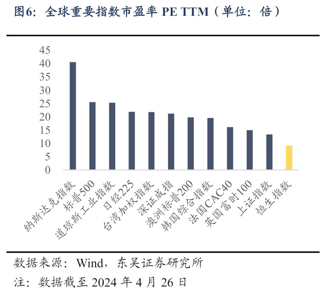 当前港股属于全球权益类资产中的估值洼地,配置价值突显。横向对比来看,在全球重要指数中,恒生指数估值排列最末。纵向对比,截至24年4月26日,恒生指数的估值(PE TTM,下同)处于2015年以来20%以下历史分位,恒生科技估值处于20年8月以来15.5%历史分位;而日股、印度股均处于近年30%以上分位,港股配置性价比较为显著,叠加日元大幅贬值下日股投资回报受损,或吸引资金在估值高低间切换。