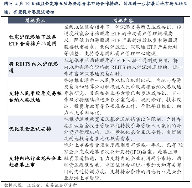 本周港股连涨离不开政策的助推。4月19日证监会发布五项与香港资本市场合作措施,旨在进一步拓展两地市场互联互通,有望提升港股流动性。其中,放宽沪深港通下股票ETF合资格产品范围,有助于增加内地可投ETF的数量和规模;人民币股票柜台纳入港股通,将降低南向资金的兑汇成本、增厚分红收益,长期来看有利于吸引社保、保险等长线资金入市。
