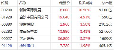 4月29日,博彩股早盘普涨,截至发稿,新濠国际发展涨超10%,金沙中国有限公司涨近5%,澳博控股、美高梅中国、银河娱乐涨超3%,永利澳门涨近2%。